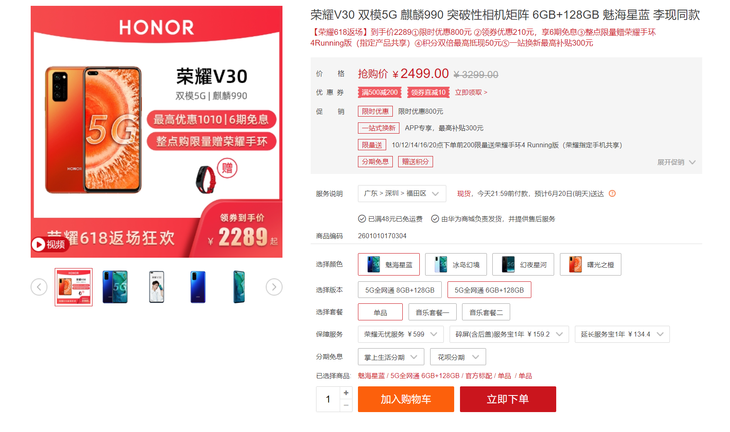荣耀V30同样是一款5G旗舰机,这次活动的优惠幅度非常大。荣耀V30 6GB+128GB版本满减后到手价只需2289元,另外还支持6期免息,具有较高的性价比,值得考虑。