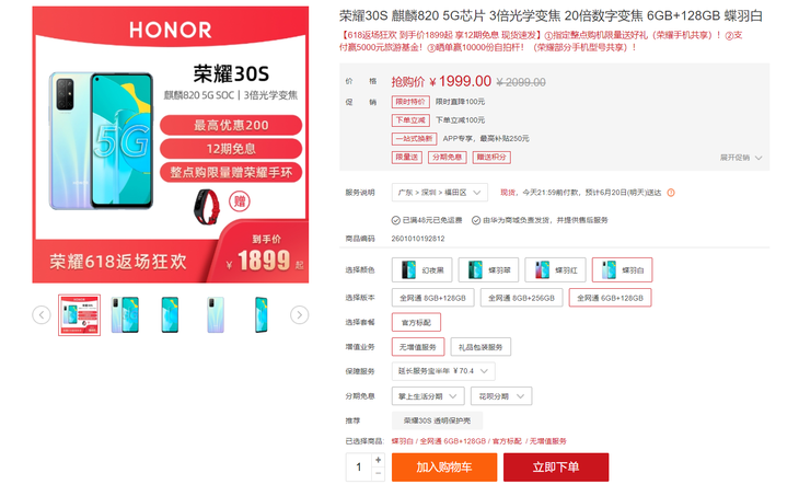 荣耀30S目前正参与618返场大促活动,6GB+128GB版本售价1999元,到手价只需1899元,还可以享受12期免息优惠,荣耀30S能够提供较为出色的综合体验,适合预算比较低的朋友选择。