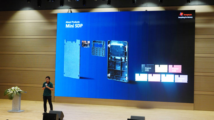 随后,江波龙SSD事业部产品负责人钟孟辰为带来了SSD产品的技术分享。纵观SSD近20年发展,其容量、性能不断提升,但除了接口类型有所新增外,并无实质性突破。江波龙 Mini SDP(SATA Disk in Package)先进突破行业想象,将主控、缓存和闪存三部分融合封装为一体,体积只有传统固态硬盘的十分之一。体积虽小,却有着防震防水、性能优越、安装简单等优点。