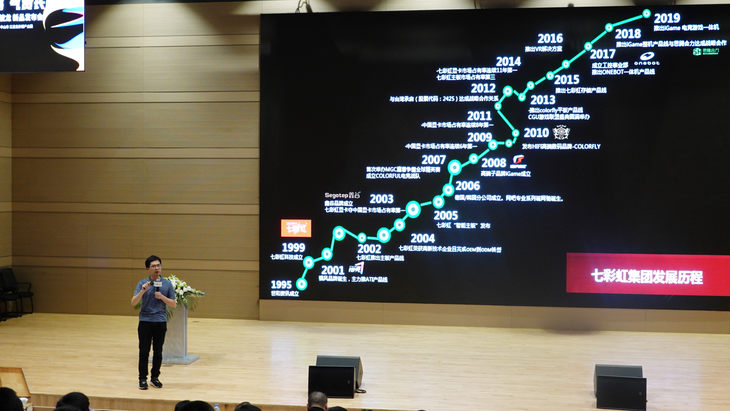接着,七彩虹存储事业部副总经理曹剑上台,向大家介绍了七彩虹的发展历史。曹剑先生介绍到,七彩虹集团成立于1995年,总部设在中国深圳。二十年间,七彩虹集团成功地由计算机零组件代理商蜕变成为拥有自主研发、自主生产、自主品牌、自主销售为一体的完整产业链企业。目前拥有国内5大战区,海外的德国汉堡、韩国首尔、印尼雅加达、印度孟买、柬埔寨金边等设置分公司和办事处。2015年,七彩虹开拓了存储产品线,自此,电脑DIY产业的所有产品都已打通,包括七彩虹品牌的显卡、主板、SSD、内存,鑫谷品牌的电源、机箱。