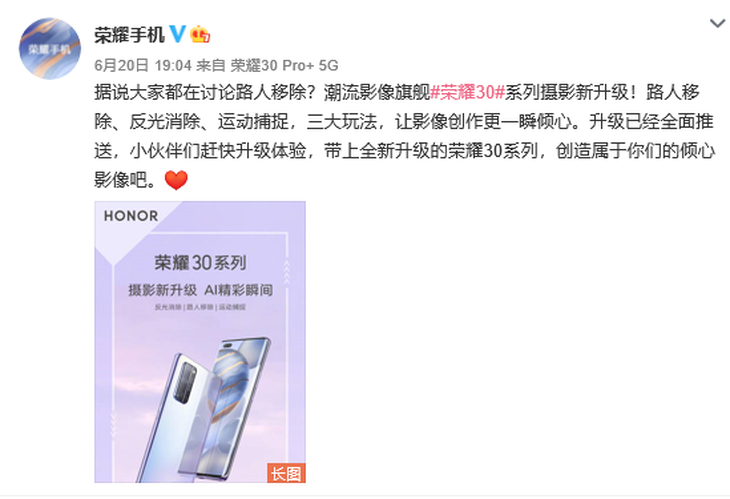 令人惊喜的是,在拥有足够优秀影像表现的情况下,荣耀30系列再次继续AI深化,带来影像升级。近日,荣耀官方微博宣布荣耀30系列(荣耀30 Pro以及荣耀30 Pro+)旗舰影像功能再度升级,聚焦包含运动捕捉、表情捕捉、反光消除、路人消除等AI精彩瞬间功能。目前已经全面推送,感兴趣的用户可以升级体验一番。