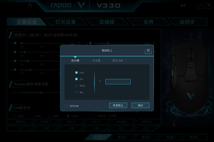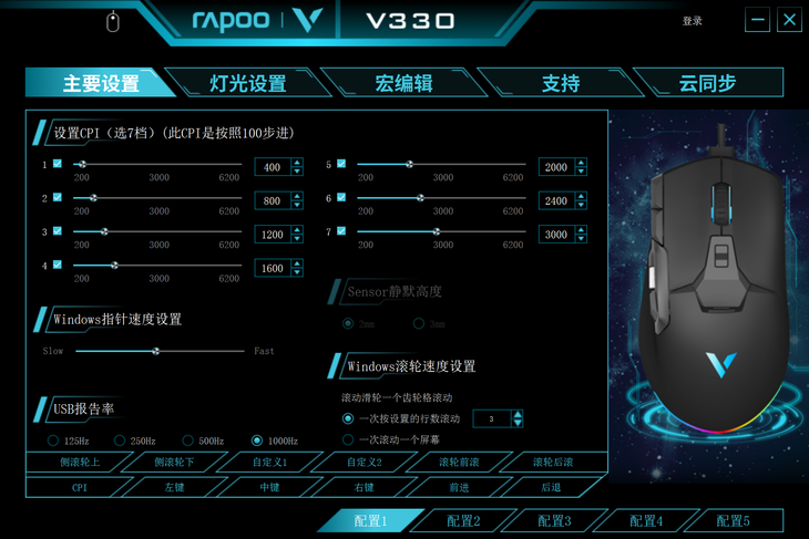 配套驱动支持5组配置文件,可以保存不同的配置组合,驱动软件的设置还可以同步到云端,使用不同设备也能快速调用。修改的配置可以存储在鼠标上,设置完成关闭驱动软件同样保留效果,使用更加方便。