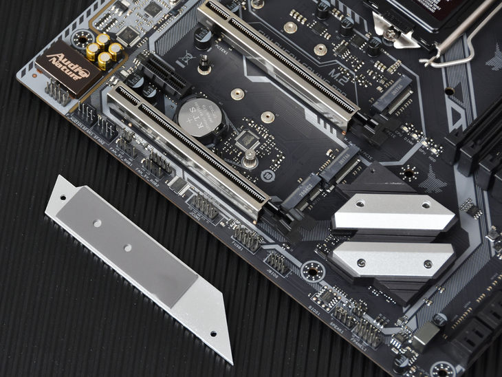 扩展插槽区域,提供两个PCIEX16插槽,两个M.2硬盘插槽,以及一个M.2无线网卡插槽。定制金属装甲,能使较重显卡更加稳固,避免插上显卡的主机在搬运过程中出现PCIE接口被扯开的情况发生。