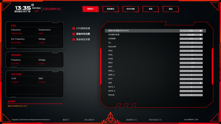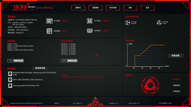 B460M GAMING PRO V20使用七彩虹升级BIOS界面,相较300系列,更加简单直观。