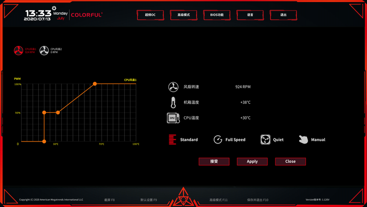 风扇状态页面,机箱温度、CPU温度、风扇转速等信息一目了然,并提供了可调节选项,方便用户根据自身需求进行调节。