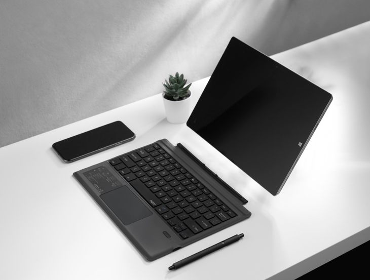 XK200采用真机开模,大小尺寸与Surface Pro3/4/5/6/7这几款12英寸平板优秀贴合,键盘上部设有专用卡槽,键盘/保护套二合一。键盘内置多块磁铁,合盖时牢固贴合Surface Pro,融为一体保护设备。上部的磁条可调整键盘支撑角度,让你手中的Surface Pro变身笔记本,享受专业娱乐办公快感。
