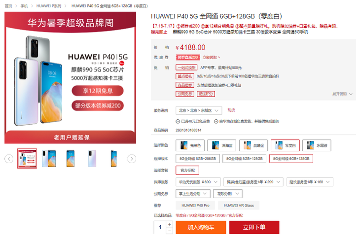 华为P40系列中,P40的官方原价是4188元起售,在本次暑期促销中直降200元,相当于成交价仅为3988元。如果你对变焦能力不是有极高的要求,华为P40的超感知徕卡三摄已经可以满足你的需求,因为在前置摄像头、芯片、EMUI10.1等多方面与大杯P40 Pro、大杯P40 Pro+是没有太大差异的。
