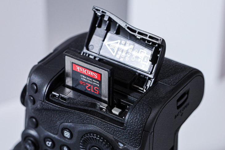 在储存方面,EOS R5采用了双卡槽设计,为了兼顾更高像素以及8K视频等庞大数据的存储,佳能EOS R5的双卡槽为CFexpress卡+SD卡。在满足高速存储需要的同时,也能实现影像数据的备份,进一步提升数据安全性,EOS R5也是佳能领先款兼容CFexpress卡的全画幅专微相机。不过,CFexpress卡(CF Type B型)储存卡虽然速度很快,但价格也不菲,比如图中的512GB卡目前售价在5000元左右;而对于没有高质量视频拍摄的用户来说,EOS R5并没有一刀切,依然提供了SD卡插槽,也是想的十分周到了。