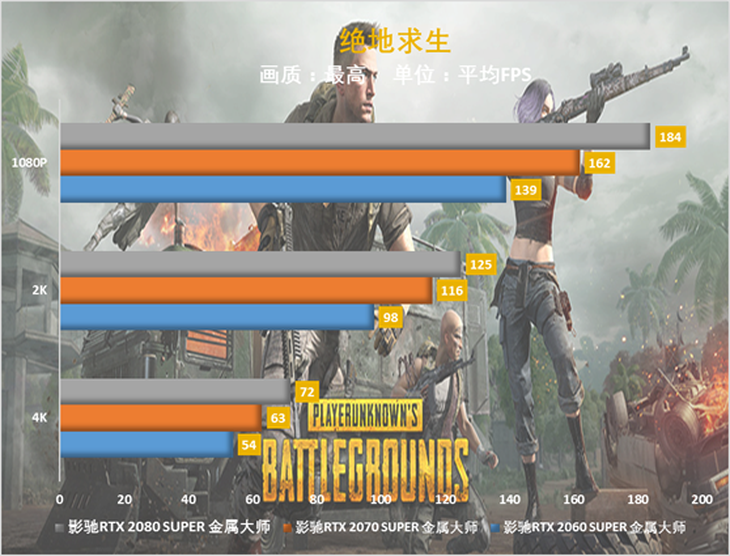 为了让玩家更直观的看出更新后游戏的稳定性,下面分别用影驰RTX 2060 SUPER金属大师、影驰RTX 2070 SUPER金属大师、影驰RTX 2080 SUPER金属大师进行了高画质下1080P、2K和4K分辨率的帧率测试。