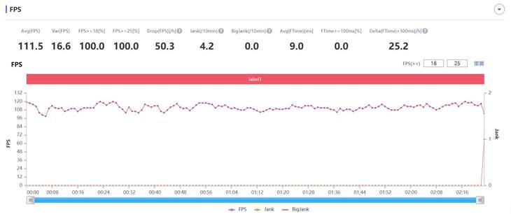 《QQ飞车》可以支持120帧模式,软件记录到的平均帧数为111.5帧。虽然游戏过程中帧率有一定的波动,帧数可以保持在96帧以上,已经可以带来远超普通60帧的流畅度。