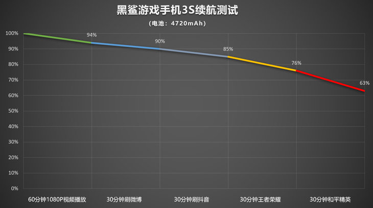 黑鲨3S配备了4720mAh大容量电池,业界首创串充并放双电池快充方案,根据不同使用状态智能切换,这种设计能够同时保证充电速度和续航能力。充电方面,配备了65W充电器。