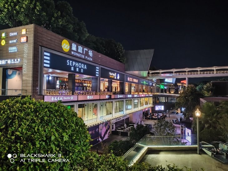 在夜拍方面,黑鲨3S支持夜景模式,夜景模式下提升明显。夜景模式下,画面高光部分表现有很大提升,高光细节更丰富,灯箱的色彩也能真实还原出来,夜景模式下画面更加纯净。