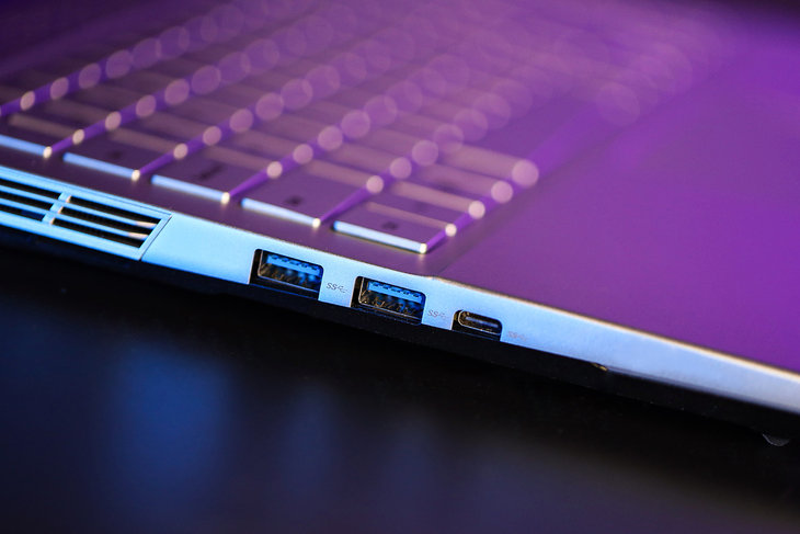 它的机身左侧设计了两个USB3.0接口、一个USB Type-C接口。