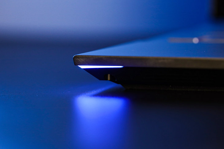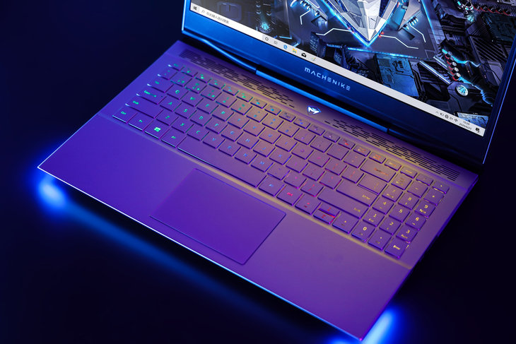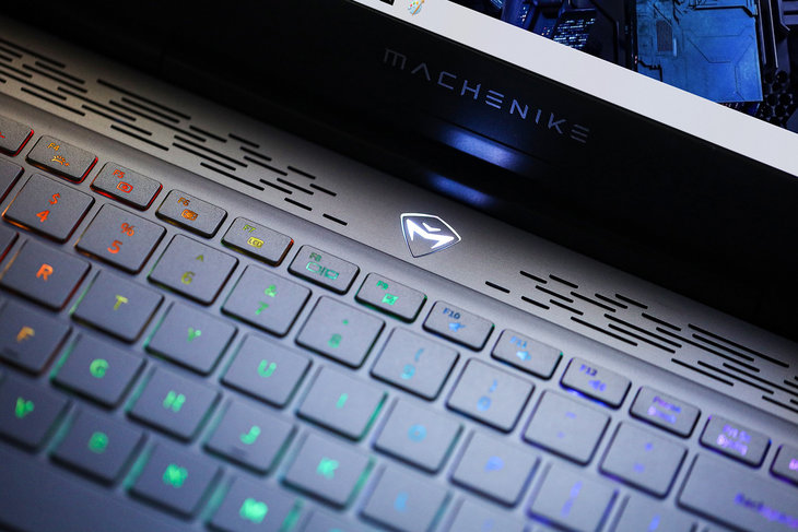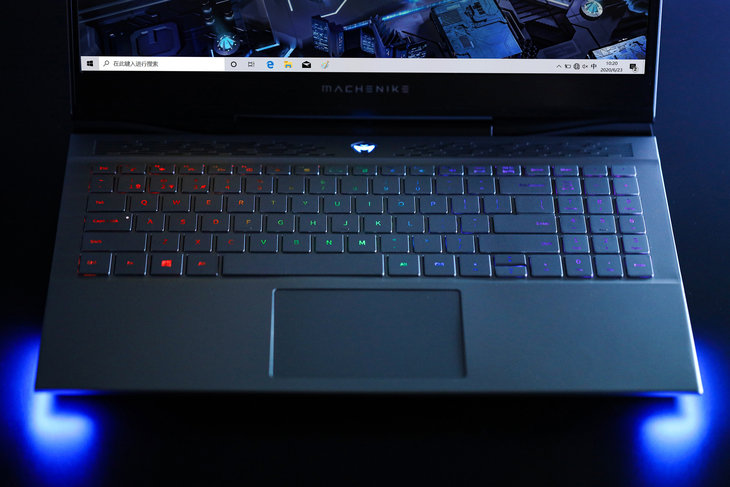 顶盖上面设计了机械师的“机械之心”LOGO以及两条装饰性的对角直线,为这款游戏本增添了几分张扬和个性。“机械之芯”LOGO内建RGB灯效模块,在开机时会呈现迷人的视觉效果。