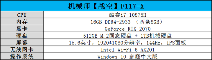 此次评测,笔者拿到手的这台机械师【战空】F117-X搭配有酷睿i7-10875H八核心处理器、NVIDIA GeForce RTX 2070显卡、144Hz专业电竞屏、512GB M.2固态硬盘、1TB机械硬盘、Intel Wi-Fi 6 AX201无线网卡等等。单从配置列表来看,这款游戏本已具备了很强的实力。