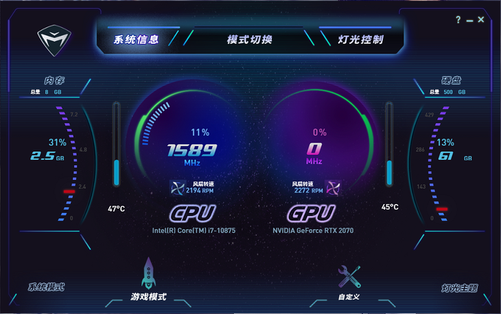CONTROL CENTER是机械师【战空】F117-X标配的系统主控软件。玩家可以通过它进行系统实时监测、电脑运行模式切换、RGB灯效调节等操作。