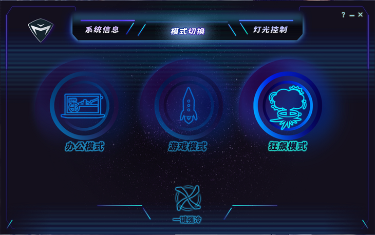 在模式切换界面下,用户可以对电脑运行模式进行切换。系统提供有办公模式(Office Mode)、游戏模式(Gaming Mode)、狂飙模式(Turbo Mode)这三种预设模式。