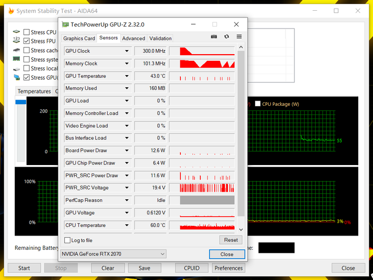 笔者利用AIDA64自带的压力测试,继续对这款游戏本的CPU和GPU进行了双烤机测试。