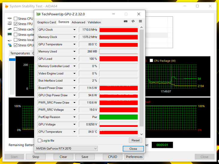 开启双烤机之后,这款游戏本的CPU温度会瞬间飙升到98℃,直接触发笔记本温度保护机制,然后CPU温度会降到80多度。通过5分钟的烤机,最终CPU温度稳定在了84摄氏度,GPU稳定在了80摄氏度。散热系统还是十分可靠的,用户们可以放心使用。