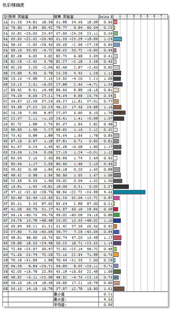 平均△E为0.96,△E≥3的颜色只有一种。显而易见,这块屏幕的色彩精准度也是相当不错的,完全能够满足不少专业性较强的办公应用。
