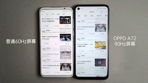 在上面慢动作对比可以看到,OPPO A72的90Hz屏幕要比普通60Hz屏幕更加平滑顺畅一些,这种流畅会体现在日常系统界面、微博、今日头条等APP的滑动中。