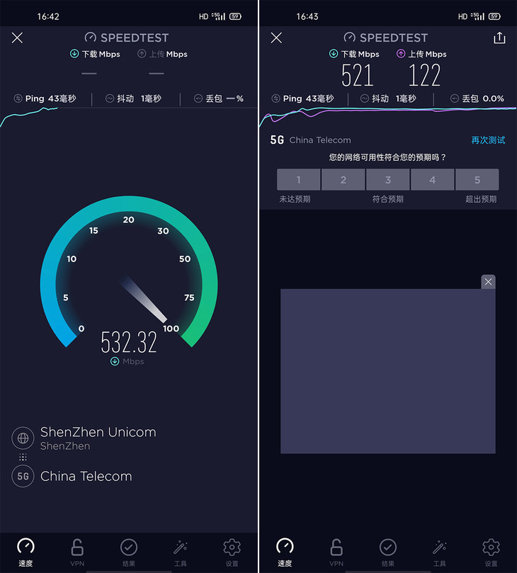 根据实际测试,OPPO A72的下载速度可以达到521Mbps,上传122Mbps,所用测试卡开通的5G套餐为500Mbps,也就是能够轻松达到套餐限制值,可以保证出色的网络体验。