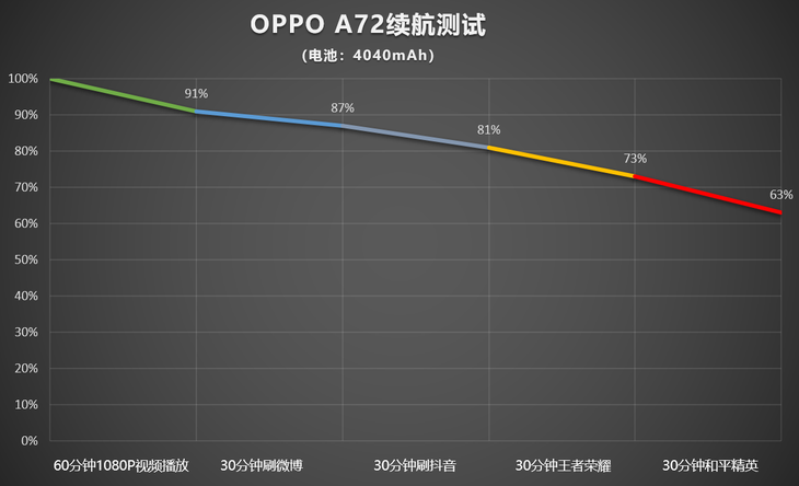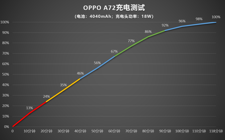 OPPO A72在轻薄的机身内置一块4040mAh电池,与之相搭配的为18W充电。我们进行了充电续航测试,具体表现可以参考下面的实测数据。