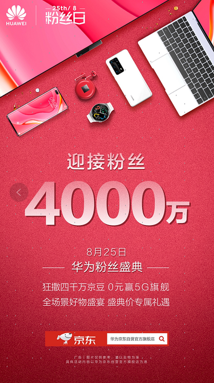 另外,据悉华为京东自营官方旗舰店即将迎接4000万粉丝量,为感谢花粉们的支持,我们准备了整整4000万京豆等你来抢~粉丝还可以参加0元抽多款华为5G热销单品活动、享粉丝日专享价等多重福利。还有更多惊喜尚未揭开,敬请期待2020年8月25日,华为粉丝日,盛大开场。