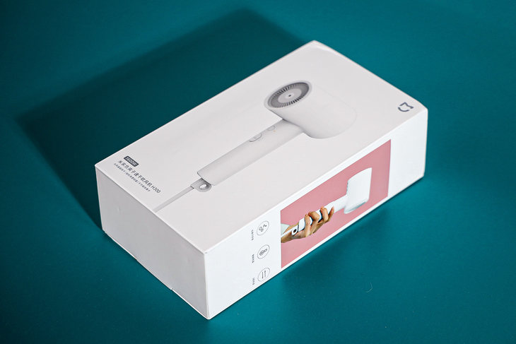 首先,在外包装放, 米家负离子速干吹风机H300为熟悉的白色简约设计,同时在侧面也标注了这款吹风机一些主打的功能,比如具备负离子护发、智能恒温以及大风速速干等特性。