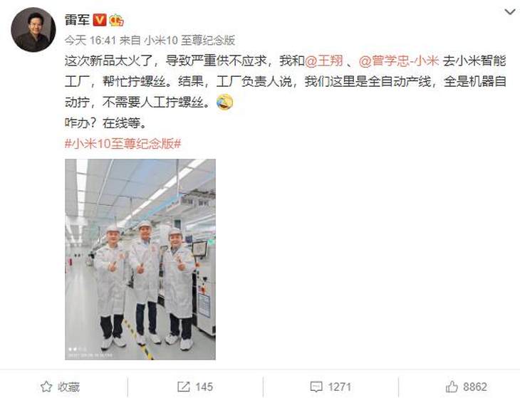 而在几日前,小米曝光了其全新的制造工厂。今日小米董事长雷军前往工厂,并发动态称:这次新品太火了,导致严重供不应求,我和@王翔 、@曾学忠-小米 去小米智能工厂,帮忙拧螺丝。结果,工厂负责人说,我们这里是全自动产线,全是机器自动拧,不需要人工拧螺丝。咋办?在线等。