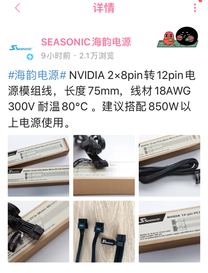 据海韵曝光消息,此电源接口为2*8pin转12pin。建议搭载850W以上电源使用。另根据海韵官方回复得知,目前尚未得知NVIDIA(英伟达)是否正式采用新接口。如若采用也尚不能确定是有显卡自带转接线或是由电源配送转接线。
