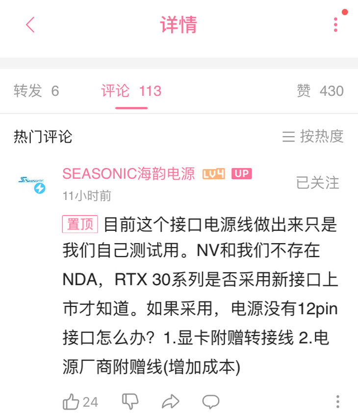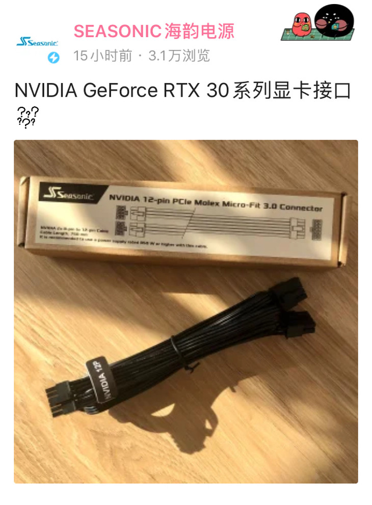 8月24日消息,海韵官方在B站发布动态将疑似RTX3090电源线曝光,海韵曝光新电源线,并配文NVIDIA GeForce RTX30系列显卡接口???