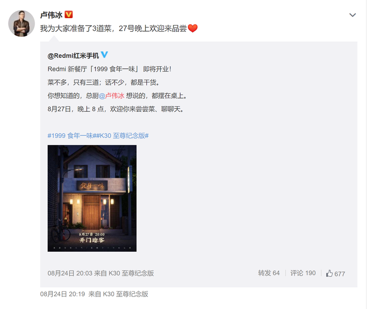 8月25日消息,Redmi今日在官微和小米社区公布,Redmi新餐厅“1999食年一味”即将于8月27日晚上8点开业,同时,“总厨”卢伟冰也回应称自己为大家准备了3道“菜”。