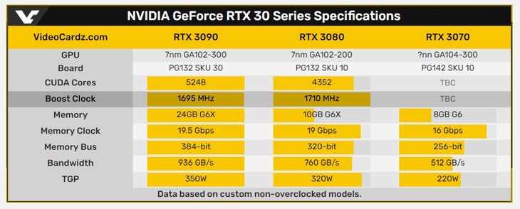 RTX 3080拥有4352个CUDA核心和10GB 的 GDDR6X 显存,320 bit 位宽,最大带宽 760 GB/s ,TGP 为 320W。RTX3070拥有8GB GDDR6显存,TGP为220W。外媒称他们拿到的数据显示RTX 30系列显卡采用了7nm工艺,但不能完全确认。