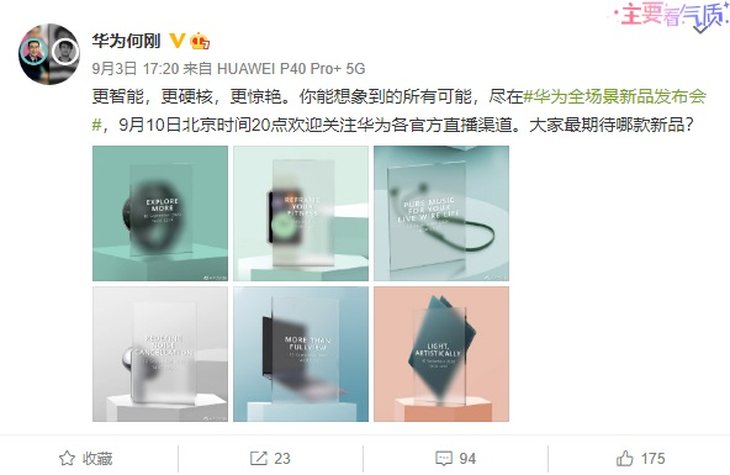9月4日消息,华为终端手机产品线总裁何刚在微博发布了有关9月10日华为发布会的新品预热海报,其中包括了不少新品。最引人瞩目的便是新品TWS无线蓝牙耳机FreeBuds Pro。