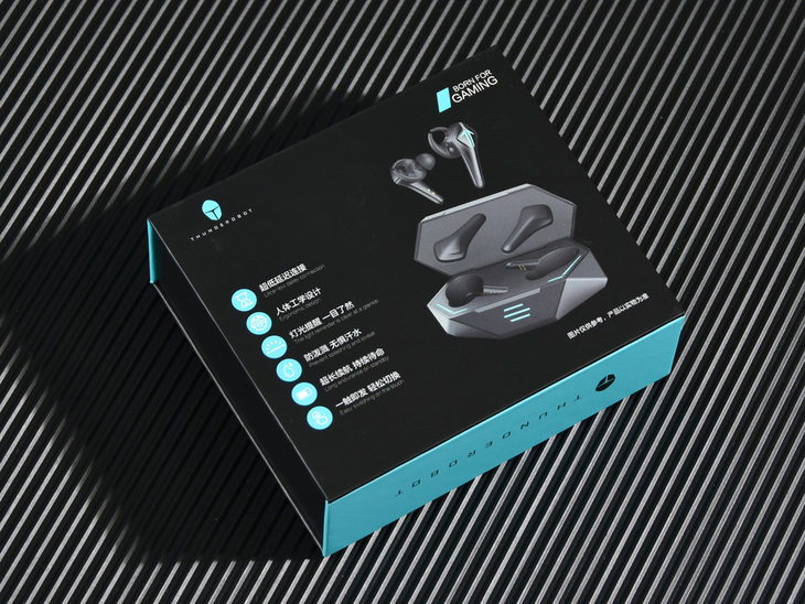 雷神TWS真无线游戏耳机HL10的包装盒大量运用了新生蓝配色,设计很雷神!同时,其包装盒正面和背面均标注有这款装备的卖点,便于玩家快速了解它的特性。