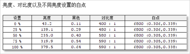 测试小结:这款显示器的色温值非常温度稳定,始终保持了6800K,色温属于偏冷的。对比度方面,50~100%亮度区间内对比度非常稳定,0~50%亮度区间内对比度波动很大。
