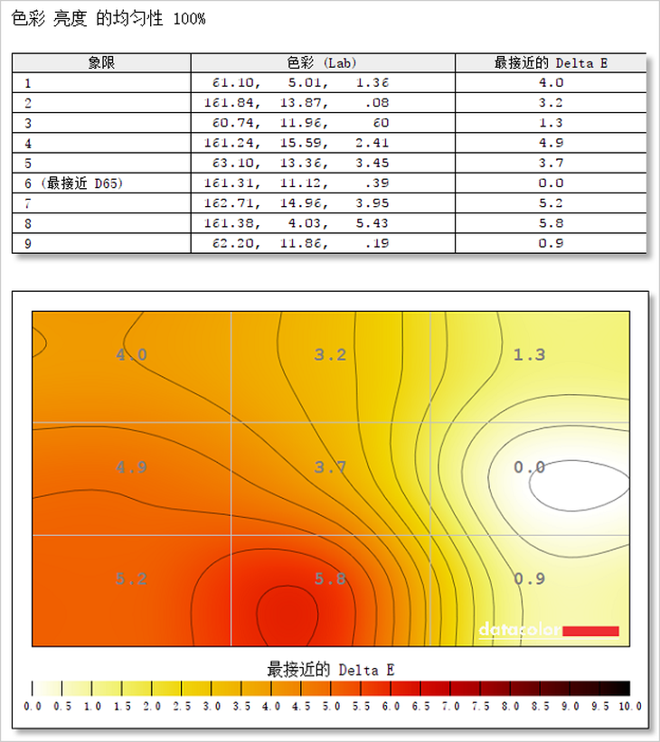 测试小结:在D65标准中,色温值为6500K表示色彩比较准确,不会出现偏冷或者偏暖。通过测试可知,这款显示器中央正右方区域(6号测试区域)最接近D65的标准。屏幕中央正下方区域(8号测试区域)偏差最大,差值为5.8。