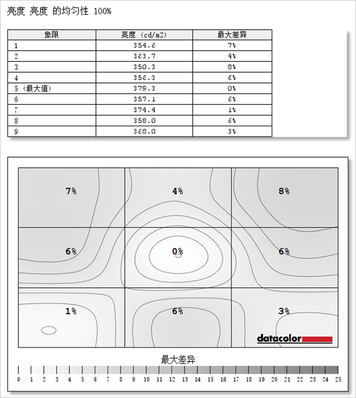 在亮度均匀性方面,这款显示器中心区域(5号测试区域)亮度高,达到了379.3cd/m2。它的右上角区域(3号区域)亮度偏差最大,差值为8%。