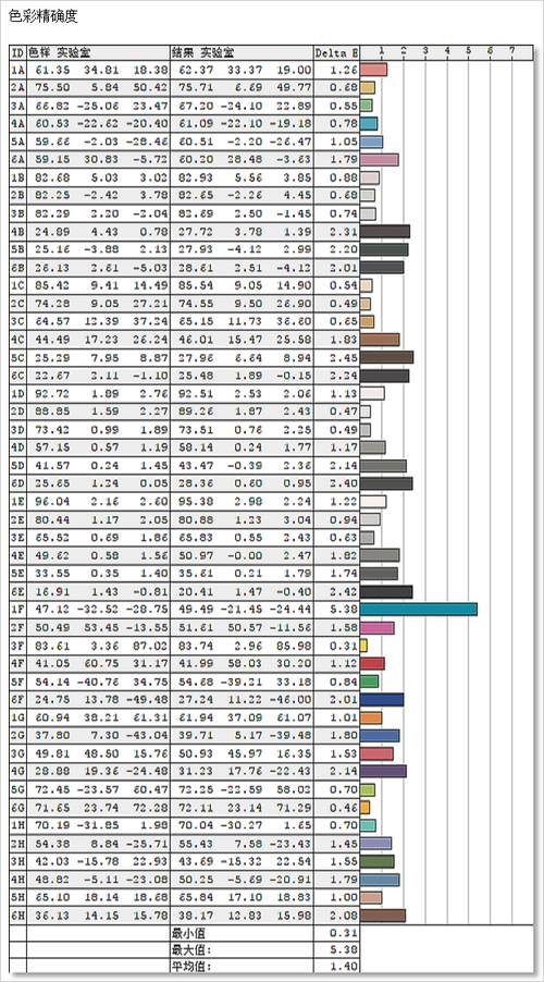 测试小结:平均△E为1.4,△E≥3且△E≥5的颜色只有一种。这样的色彩精准度无疑也是非常不错的。