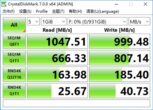 根据CrystalDiskMark这款测试软件的成绩来看,这款硬盘顺序读取速度可达1047.51MB/s,顺序写入速度可达999.48MB/s。
