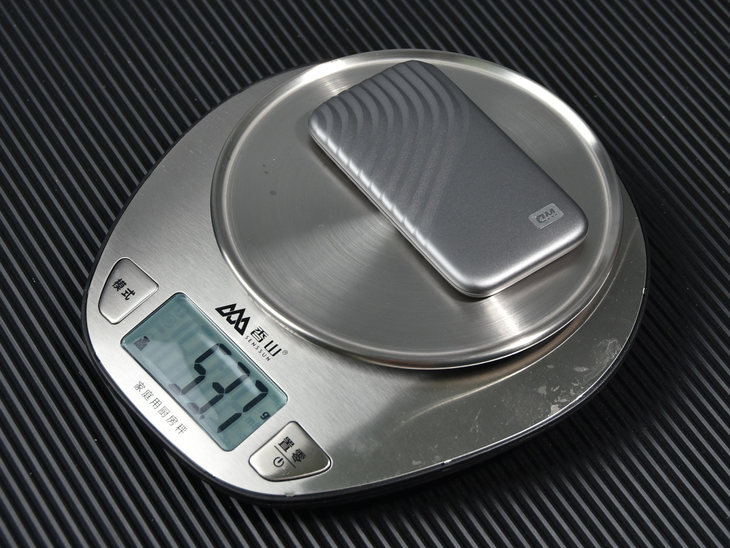 经过实测,这款硬盘的本体重量约53.7克。带上Type-C数据线与Type-C转USB的转接头之后,这套设备重量约70.8克。显而易见,这款硬盘是相当轻便的。