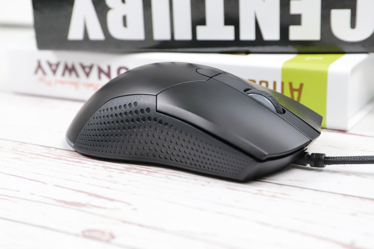 鼠标左右侧裙都采用防滑设计,分布着孔状纹理,可以起到有效的防滑作用。侧边配备了两个按键,按键质感跟鼠标表面类似,默认为前进/后退功能。侧边按键使用起来很顺手,点击清脆。