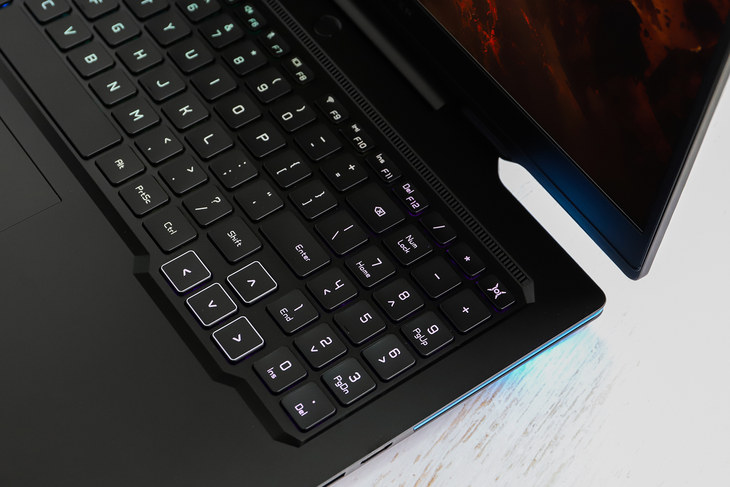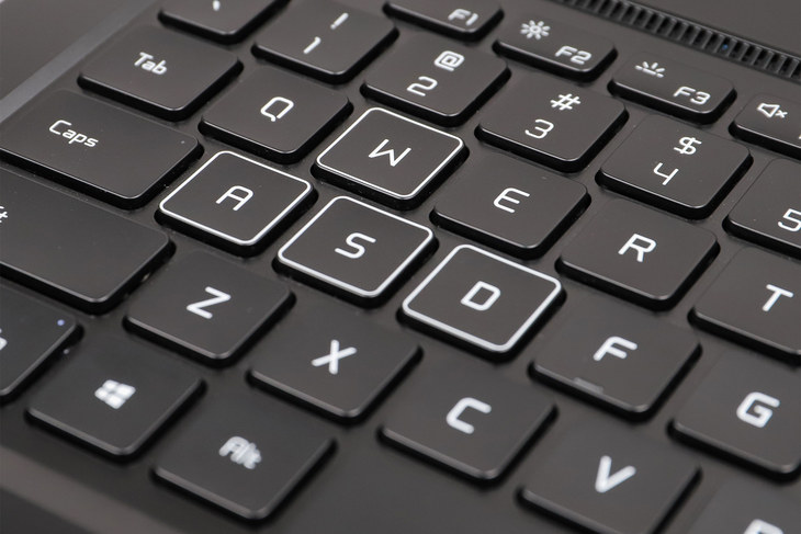 笔记本C面手感同样很细腻,手托可以提供舒适的承托感。笔记本键盘为定制四色区背光键盘,按键采用一定弧度的凹陷处理,更加贴合指尖弧度,能够提升按键手感。