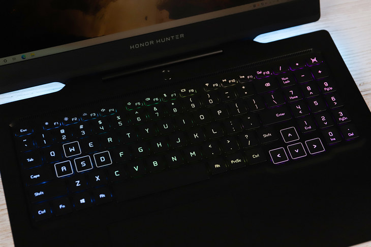 按键尺寸、间距都保持在不错的水准,拥有1.8mm键程,按键操作反馈清晰,体验好,同时还支持29键无冲突。荣耀猎人游戏本V700还在游戏玩家常用的WASD按键上进行了高光突显处理,右侧的方向按键同样也有高光突显处理,对游戏玩家更加友好。