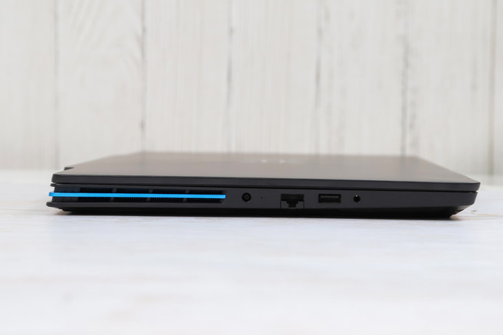因为独特的升降式风谷散热设计,机身左右侧的接口都进行了一定下移,更加接近手托部分。接口包括1个3.5mm耳机孔、1个Type C接口(支持显示、数据传输)、2个USB-A接口(USB 3.2 Gen1),1个USB-A(USB 2.0)、1个RJ45接口、1个HDMI 2.0接口。