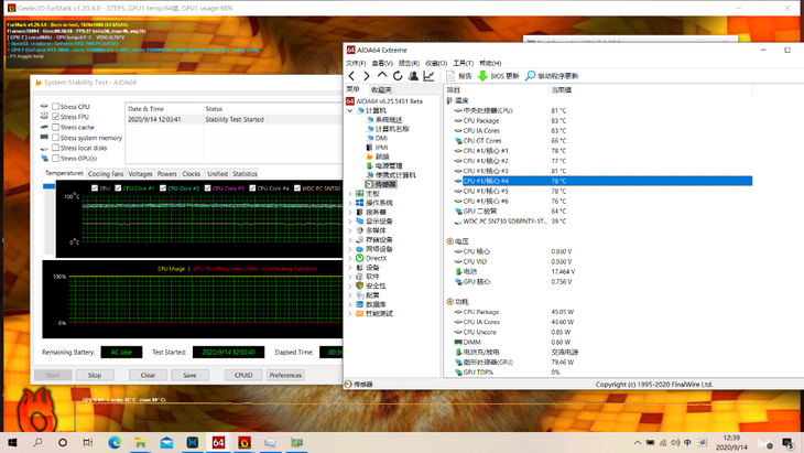 在散热上,我们通过近半小时的AIDA64+Geek3D FurMark进行极限双烤,在AIDA64进入系统稳定性测试勾选FPU,在Geek3D FurMark中设置 1920*1080 8xMSAA,之后同时开始双烤进行测试,在室内温度28摄氏度的情况下,开启笔记本狂战模式进行烤机。