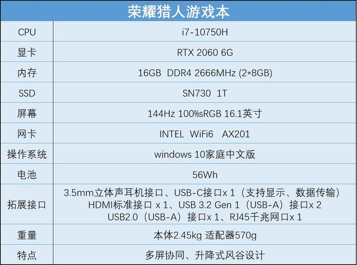 评测开始前,我们先通过一张表格来了解下此次评测机型的具体配置。