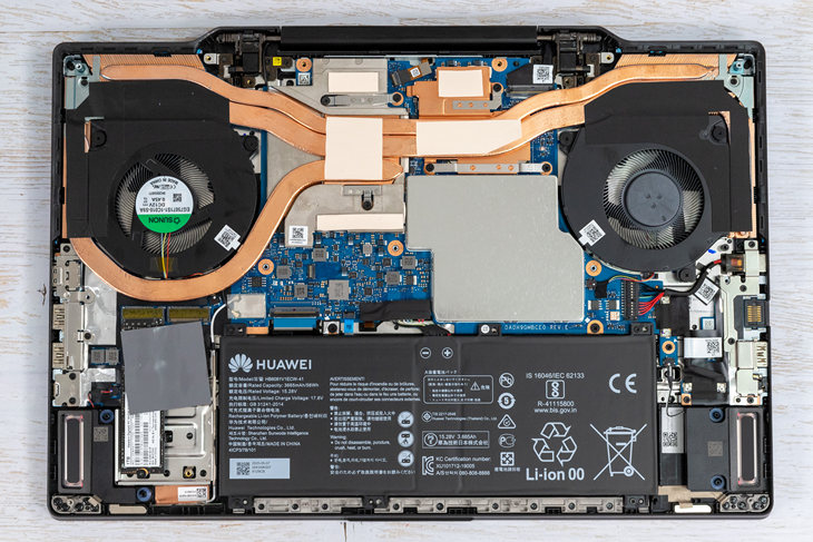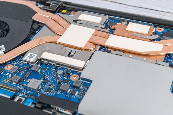 核心散热模块由双风扇三热管组成。两个12V大风扇分别向侧方和后方出风,共四个出风口,风量非常足;一粗一细两根热管串联了CPU和显卡,还有一根粗热管单独为显卡散热;热管周围的均热板面积很大,覆盖了显存、供电和南桥;热管没有做黑化处理,而是用导热硅胶传导到后盖的金属部分。