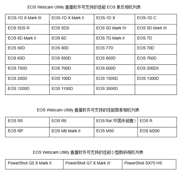 其实早在今年4月,佳能美国就开发并推出了EOS Webcam Utility直播软件测试版,将相机与电脑通过USB线缆进行简单连接,即可获得更清晰的视频效果。而此次在中国上线的EOS Webcam Utility直播软件,可兼容的佳能数码相机数量增加至42款,其中包括新发布的EOS R5、EOS R6,以及多款EOS系列单反相机、EOS R系列专微相机、EOS M系列微单相机、PowerShot系列小型数码相机等。全面覆盖单反、微单以及小型数码相机的更多机型支持。